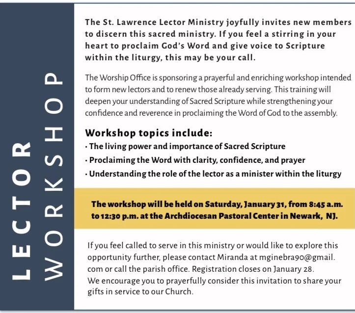 Saint Lawrence is a parish family united as disciples of Jesus. We welcome all to our community of faith. Our goal is to share and foster the gospel values of worship, charity, justice and service.